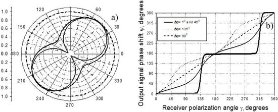 Output amplitude (a) and phase (b) as functions of receiver polarization angle for : and 45° (solid lines); (dashed lines); 135° (dotted line in Figure 18b).