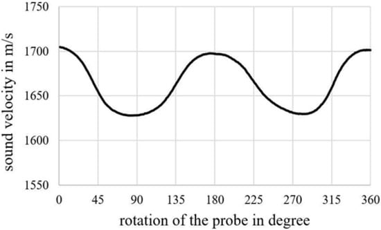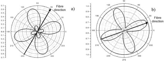In multiply composites, a similar experiment identifies a major reinforcement direction which is caused by various fibre orientations in lay-up stacks. To identify the fibre lay-ups involved the measured polarization velocity curves have to be examined against the simulation results for reference composite structures. The latter can be obtained by using the analytical partial wave approach (Section 3.2) or the MatLab calculations of successive reflections/transmissions at the interfaces between the plies []. The minimum difference between the measured and the simulated results indicate a close equivalence of the multiply composite studied to the reference arrangement.