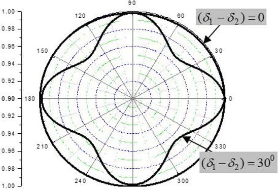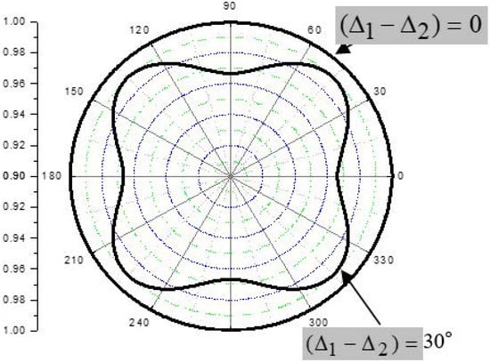 The results of calculations (Figure 21) show that azimuth angle variations of both the amplitude and the phase depend exclusively on the in-plane stiffness asymmetry (δ1 − δ2) between the 0° and 90° layers. The contribution of the symmetrical (+45° − 45°) lay-up is zero due to balancing of birefringence. When (δ1 − δ2) = 0, the birefringence in (0–90°) lay-up is also cancelled and the composite laminate is fully isotropic.