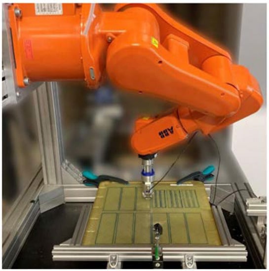 As it was shown in Section 3.1, the fibre direction in a unidirectional (UD) reinforced composite is readily determined in the birefringence reflection mode by detecting a “fast” wave polarization. Such an experiment includes a single sided shear wave generation/detection followed by the measurements of the amplitude/phase (delay) of the output signal as a function of polarization angle (polarization amplitude/phase (velocity) curve). In our experiments, the Krautkrämer ultrasonic flaw detector (USIP 12) was used for excitation/reception of (2.5–4) MHz shear wave pulses generated by piezo-transducers with known polarization direction. The transducer was attached to the hand of the six-axis robot IRB 120 (supplier ABB, Switzerland) and pressed against the specimen through a layer of viscous ultrasonic coupler; the generated/detected wave polarization was varied by rotation of the transducer (Figure 23). Such a setup is sufficient for mapping the fibre orientation by recording the polarization angle corresponding to the “fast” wave in the specimen. An example of the polarization velocity curve measured in a stacked UD GFRP is shown in Figure 24 where the “fast” wave polarization is along 0° and indicates the orientation of continuous fibres in the plate.