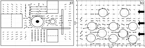 The examples of mapping of short glass fibre orientations in polymer industrial components produced by injection moulding are shown in Figure 25. The “fast” polarization directions are indicated by arrows; the length of the arrows is proportional to a local degree of reinforcement (∆φ). The specimen in Figure 25a is a large (300 × 200 × 4 mm3) polyurethane plate with the holes formed by circular barriers in the mould. The arrow pattern measured is in a good agreement with expected streamlines in the mould (polymer flow from right to left). Some additional reinforcement observed around the holes is evidently due to accumulation of fibres in the vicinity of the barriers.