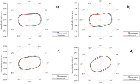 Comparison between measured and simulated polarization velocity curves for various fibre stacks in GFRP: (a) [0°/0°/5°/5°], (b) [0°/0°/10°/10°], (c) [0°/0°/20°/20°] plate, (d) [0°/0°/45°/45°] plates.
