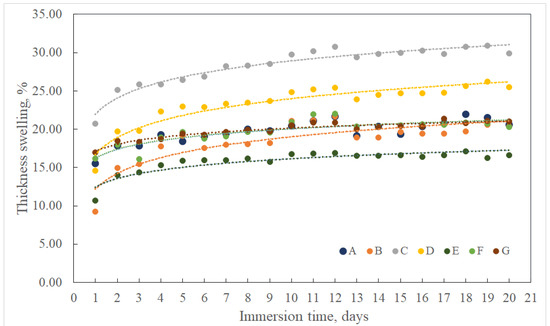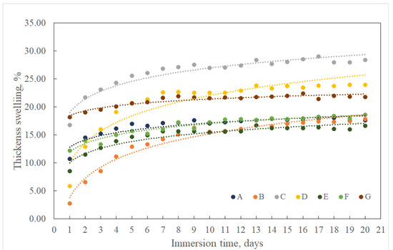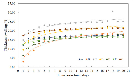 Relationship between immersion time and thickness swelling of particleboard samples with dimensions 2.5 × 2.5 cm for all categories (A–G).