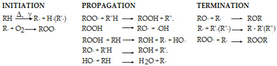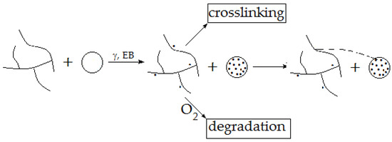 The discussion of radiation effects on polymer composites as the precursors of hybrids, the innovative materials, has opened a large door for the extended applications in several areas of the following activities: modeling [1,2], medicine [3,4], transport [5,6], energy [7,8], electronic devices [9,10], sensors [11,12], food packaging [13,14], building composite materials [15], water desalinization [16] and many others. The inclusion of hybrids through the composite category depends undoubtedly on the deep interpenetration and the specific association of the constituent phases [17]; an explanatory example for the capacity of ionizing radiation for the adjustment of polymer blends into hybrid structuration is the irradiation of chitosan/poly(vinyl alcohol) systems [18]. The stable configuration of hybrids supposes the interphase compatibility and the formation of bridges between the host polymer and filler [19]. The behavior of fillers and the stability of polymer matrix in hybrid materials are the essential features that characterize the wearability of hybrids [20]. The preparation routes of added nanoparticles challenge options for the appropriate solutions that open new perspectives for the manufacturing conditions of the homogenous multiphase products [21]. The ascending interest paid on the complex approach on the subject of engineering polymer hybrids creates optimal support for the publication of relevant reviews [22,23,24,25,26,27]. However, the radiation effects are only scarcely caught. The complexity of the interaction between incidental high energy radiation and biphasic polymer-based hybrids gathering a broad variety of compounds is inviting the academic sphere to detailed assays, because the structural modifications may lead to a new concept of materials [28]. Starting from the radiation stability of the C–C backbone, molecular changes are related to the fate of radical intermediates [29], which follows the polymer radiation chemistry [30]. The utilization of polymer hybrid materials processed by high energy irradiation depends intrinsically on the stability class from where they belong: crosslinkable or degradable compounds. The prediction of long term behavior of irradiated materials is based on the ratios between the crosslinking and scission radiochemical yields that are illustrated by the width of irradiation range practice [31,32]. The radiation processing may become a persuasive and economical method through which polymeric blends may gain a hybrid texture [33]. The extension of operation areas is allowed by the presence of filler, which may scavenge the former radicals forming by the fragmentation of the degradation chain [34]. The irradiation conditions (integrated dose, dose rate, environment, additives) are the main parameters that define the availability of materials to keep the initial functional features constant. The general mechanism that describes the progress in the degradation of polymers is initiated by the scission of weaker bonds followed by the oxidation of radical intermediates [35,36]. The inhibition attained in the progress of oxidation is effectively obtained at any stage of degradation (Figure 1), when the radicals can be physically or chemically scavenged on the surface of nanoparticles.