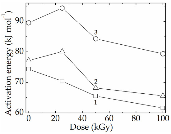 The variation of activation energy for the radiooxidation of polypropylene in the presence of microalgal masses [126]. (1) None; (2) chlorella vulgaris; (3) spirulina platensis.