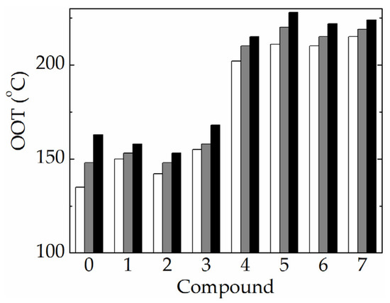 The histogram of OOT values obtained for eight coordinative compounds of copper with various ligands at three heating rates (°C min−1): (white) 5; (dark grey) 10; (black) 15 [134].