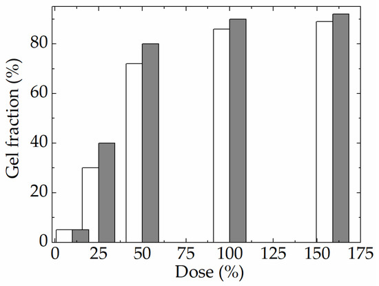 The percentage of gel fraction formed in irradiated EPDM [47]. (white) pristine polymer, (light grey) polymer with PbZrO3/Nb doped nanoparticles.