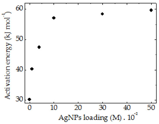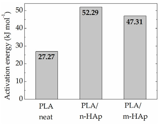 The influence of the particle size and the stability effects of fillers under irradiation were investigated in PLA/HAp composites [160]. The interphase surface is a main factor that controls the amplitudes of component interaction. The oxidability and water penetration are the properties that delimit the performances of PLA hybrids and their application ranges. The differences in the activation energies demanded that the degradation of PLA/HAp hybrids (Figure 10) may be reflected in the thermal characteristics, which obtain corresponding figures in the dependence on size and concentration of filler.