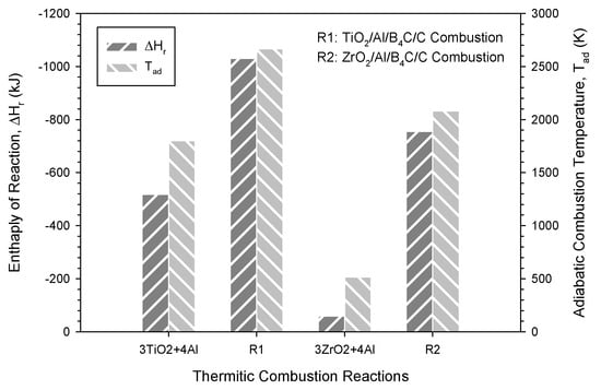 The aluminothermic reduction of metal oxides (TiO2 and ZrO2) is considered as the initiating step in R1 and R2 but the solid-state combustion of R1 and R2 cannot start off without the activation of PTFE. This could be due to the weak reaction exothermicity or the high kinetic barrier of the initiation reaction. As shown in Figure 1, the calculated values of the reaction enthalpy (ΔHr) and Tad are relatively low for the aluminothermic reduction of TiO2 and ZrO2, especially in the case of 3ZrO2 + 4Al. Unlike most of the thermites with Tad exceeding 3500 K [], TiO2/Al and ZrO2/Al mixtures are low-exotherm thermites. Figure 1 also shows significant increases in ΔHr and Tad for R1 and R2, since their products, namely transition metal boride (TiB2 and ZrB2) and carbide (TiC and ZrC), are high-exotherm compounds. Moreover, TiO2/Al-based R1 is more exothermic than ZrO2/Al-based R2. Even although R1 and R2 have Tad values of 2665 K and 2080 K, respectively, it was found that their initiation was infeasible without PTFE addition. As a reaction promoter, PTFE is able to facilitate solid-phase diffusion by means of the gas-phase transport agent to overcome the kinetic limitation and assist the synthesis reaction to proceed [].