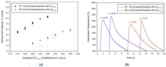 The effect of the PTFE content on the flame-front propagation velocity of R1 and R2 is presented in Figure 3a. The increase in PTFE from x = 0.15 to 0.35 was found to accelerate the combustion wave of R1 from Vf = 2.68 to 4.17 mm/s. A slower combustion wave was observed for R2, most likely due to its weaker reaction exothermicity, with the wave speeds ranging from 1.74 to 2.95 mm/s for the PTFE content from y = 0.35 to 0.5. It has been proposed that gas-phase transport agents in the form of metal fluorides can effectively improve the solid-phase diffusion, which is critical for solid-state combustion to proceed in a self-sustaining manner []. Regarding metal fluorides, TiF3 could be produced in R1 from the interaction of C2F4 with TiO2 and ZrF4 in R2 from C2F4 reacting with ZrO2 [,].