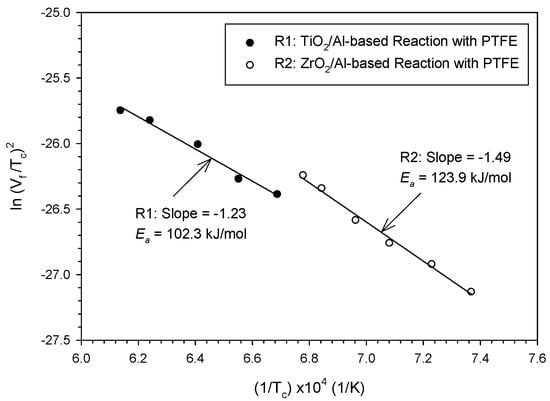 The correlation of the combustion wave velocity with the reaction temperature was applied to determine the activation energy (Ea) of the solid-state combustion reaction from the slope of a best-fitted linear line in the plot of ln(Vf/Tc)2 versus 1/Tc []. As presented in Figure 4, the values of Ea equal to 102.3 and 123.9 kJ/mol were deduced for R1 and R2, respectively. A lower Ea suggests that R1 is more favorable in the kinetic aspect. Thermally, R1 is also more energetic. This explained why the threshold amount of PTFE required to trigger the SHS process was lesser for R1 than R2.