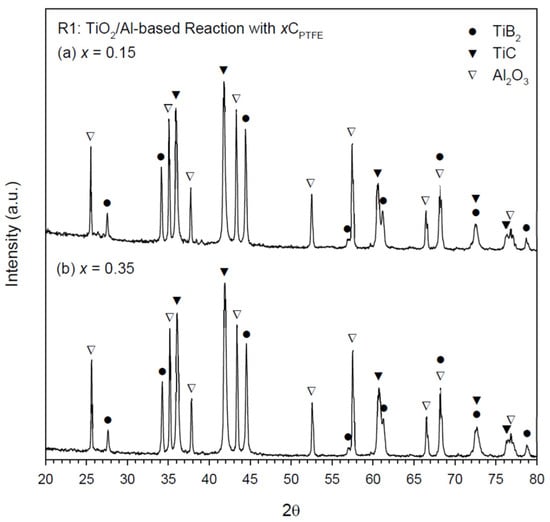 The products of SHS were crushed and ground into powders for the XRD analysis by using a porcelain mortar and pestle. The XRD patterns of SHS-derived products from R1 with PTFE values of x = 0.15 and 0.35 are presented in Figure 5a,b, respectively. Both samples produced triplex composites composed of TiB2, TiC, and Al2O3. The crystal structures and powder diffraction data for TiB2 refer to JCPDS (Joint Committee on Powder Diffraction Standards) card number 85-2083, TiC to JCPDS 89-3828, and Al2O3 to JCPDS 88-0826 []. No unreacted reagents or impurities were detected, even for the sample with the threshold amount of PTFE of x = 0.15; that is, the complete conversion from the reactants to products was achieved by R1 under PTFE activation.