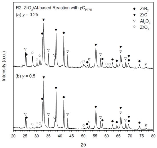 Figure 6a,b contains a representation of the XRD patterns, which were collected for the zirconium-containing samples. Three target phases, ZrB2 (JCPDS 89-3930), ZrC (JCPDS 89-4054), and Al2O3, were identified along with ZrO2. The existence of ZrO2 indicates incomplete aluminothermic reduction. It was found that the increase in PTFE from y = 0.35 (the threshold amount) to y = 0.5 decreased ZrO2 considerably. According to Lee et al. [], PTFE is able to remove the oxide shell on the surface of Al particles and to enhance the reactivity of Al. As a consequence, the reduction of ZrO2 by Al was improved and the amount of ZrO2 left in the final product was trivial, as shown in Figure 6b.