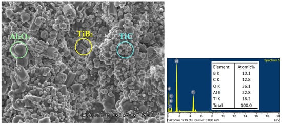 Figure 7 and Figure 8 present SEM images and EDS spectra of the fracture surfaces of the products synthesized from R1 with x = 0.25 and R2 with y = 0.5, respectively. As illustrated in Figure 7, the composite is composed of TiB2, TiC, and Al2O3 with different morphologies, including short rods of TiB2 (with length of 3–4 μm), small spheres of TiC (about 1–2 μm), and agglomerated grains of Al2O3 (about 5–7 μm). Because of the formation of gas-phase species during combustion, the discharge of gases created pores and cracks and caused delamination and elongation of the product. Therefore, the final products were porous, constituent grains were loosely bound, and composite powders were easy to obtain. The EDS spectrum of Figure 7 reveals the detection of all five elements from the SEM image. The quantitative elemental percentages are in reasonable agreement with the product composition of TiB2 + 2TiC + 2Al2O3 in R1.