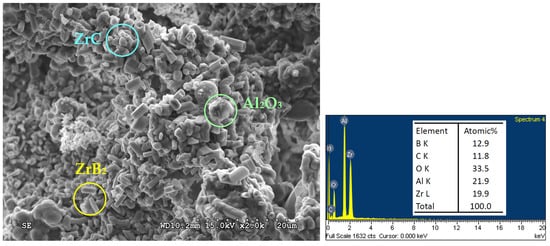 The SEM image in Figure 8 shows that the microstructure of the ZrB2–ZrC–Al2O3 composite of R2 is similar to that of the TiB2–TiC–Al2O3 composite of R1. Short-rod ZrB2, fine spherical ZrC, and granular Al2O3 can be clearly observed in Figure 8. Additionally, the EDS analysis detected all five elements and provided an elemental ratio. The atomic percentages reported in Figure 8 are close to the composition of ZrB2 + 2ZrC + 2Al2O3.