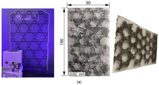 The experimental results revealed that the starch-based nanocomposite films exhibited enhanced mechanical properties at a glycerol concentration of 20 wt% and clay content of 3 wt%. After a series of laboratory tests to characterize the structure of the sandwich panel, it was concluded that starch-based films with a plasticizer concentration of 20 wt%, sodium montmorillonite content of 3 wt%, cellulose concentration of 10 wt% and fiberglass fabric (with irregular structure) were selected as suitable for bonding films to the PLA surface. This procedure resulted in compact and rigid membranes (0.4–0.5 mm thick) with smooth surfaces and no cracks. The films (in dimensions 90 × 190 mm) were bonded with the adhesive to the surface of a 3D-printed PLA core.