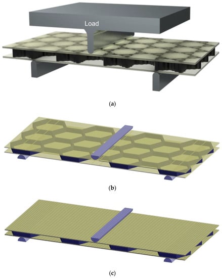 (a) A 3-point bending test set-up illustrated photorealistically with 2nd order hierarchy 3D-printed core assembled between the starch and fiberglass top and bottom skins, (b) CAD geometry of PLA honeycomb structure illustrated with zero level of hierarchy (regular honeycomb), (c) the corresponding mesh used in finite element analysis.