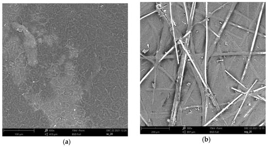 The morphology of the obtained samples and the degree of dispersion of cellulose fibers and fiberglass fabric in the plasticized starch matrix were examined by scanning electron microscopy (SEM). SEM micrographs of thermoplastic starch with 20% glycerol, 3% NaMMT and 10% cellulose content (sc_20) are shown in Figure 5. Figure 5a shows thermoplastic starch containing 20% glycerol, 3% NaMMT, 10% cellulose fibers and a layer of fiberglass fabric. The image of thermoplastic starch with 10% cellulose, without the fiberglass layer, shows a compact morphology of swollen granules surrounded by material which presumably consisted of amylose chains, glycerol and water. Figure 5b shows samples including a layer of fiberglass, with a smooth and homogeneous surface. It can be seen that the starch-based films with 10% cellulose with no fiberglass fabric and films with 10% cellulose and fiberglass fabric showed surfaces without noticeable breaks or cracks, with a fairly homogeneous distribution of cellulose fibers and NaMMT particles in the thermoplastic starch matrix with randomly oriented fiberglass fibers.