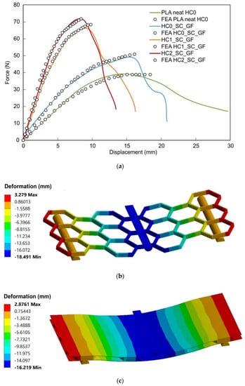 (a) Force–displacement graphs from 3-point bending tests and curve-fitted data obtained from the FEA, (b) the deformation behavior of the PLA specimens and (c) the deformation behavior of PLA HC0 sandwich specimens.