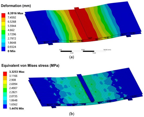 The starch skin panels reinforced the bending strength of the PLA honeycombs, since the maximum stress observed for the PLA (without skins) was calculated to be 1.73 MPa and the corresponding response for the zeroth-, first- and second-level hierarchies of the sandwich structures was reported to be 2.20, 2.90 and 3.33 MPa, respectively. The FEA results of the deformation along with the equivalent von Mises stresses of the second level of hierarchical sandwich specimens are demonstrated in Figure 8a,b, respectively. Compared to other studies [,], the sandwich structures of biodegradable composites of the current work showed improved physical and mechanical properties with a greater increase in flexural strength.