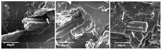 Figure 1 displayed the SEM micrograms of PP-SC (A), PP-SC-NaOH (B) and PP-SC-silane (C). It is clear when the untreated composite (A) is compared with the rest (A and B) that there is a reduction in the cavity size adjacent to a fiber. This suggests a better compatibility of the fiber and PP with those treatments. Furthermore, the NaOH treatment seems to be more effective than the silane treatment as there is a clear reduction in the fiber size from approximately 35 µm to 20 µm compared to the untreated (A), whereas the silane treatment (C) has about 27 µm (see the arrow). These observations do not seem strange when one examines the literature [1,2,3,4,5]. However, in this study, it could further be argued that the fiber dispersion is better at NaOH treatment than A and C precisely due to the fact that the surface at B appears smoother, with less fiber pull outs than A and C.