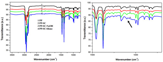 The presence of SC reduced the intensities of most peaks, pronounced from approximately 1100 to 800 cm−1. In fact, SC in PP-SC composites diminished the peaks at 1102, 1222 and 1258 cm−1, yet reappeared in the composites with treated SC. There is a broad developed peak of PP-SC-silane composite at 1062 cm−1 related to C=C aromatic skeletal vibration of SC phenols (See an arrow). The observations are common in the literature and are mostly associated with the presence of a compatibilizer [6,7,8,9,10,14]. As there is no compatibilizer in the current study, the decreased intensities could be due to the reorientation of polymeric chains as the results of interfacial interaction with SC fibers, while appearance and disappearance of the peaks explain different forms of interfacial interactions owing to the surface modifications of SC. The broad peak in PP-SC-silane composite could indicate that the components in the composite have a unique interfacial interaction compared to other composites.