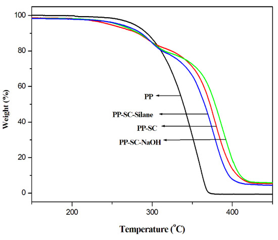 The TGA curves of the pure PP and of composites having 1.5% of untreated SC, NaOH and silane treated at a heating rate of 10 °C·min−1 are reported in Figure 3. Pure PP showed a single degradation step, while all composites showed two steps degradation and an increase in char content. The first and second stages of the composites could be attributed to the SC and matrix decompositions, respectively. The increase in char content could probably be due to some cross-linked structure as the result of the interaction between the free radicals of both the PP and organic compounds of SC. The similar standard deviation values taken at 450 °C suggest that the SC in the polymer matrix was fairly homogeneous (Table 2). The presence of the SC in PP showed a clear increase in thermal stability. In comparison to the composite containing untreated SC, the sodium hydroxide treated SC revealed a higher thermal stability, whereas the lower stability was detected from silane treated SC composite. The effectiveness of the NaOH treatment is already corroborated by SEM results, which could place the surface area of SC at the center of TGA explanation.