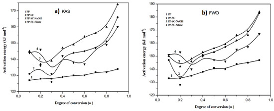 To get more of an insight into the thermal degradation processes, thermal degradation studies were undertaken. The most popular methods, and apparently the most accurate at determining the kinetic parameters, are the Flynn–Wall–Ozawa (FWO) and the Freidman and Kissinger–Akahira–Sunose (KAS) methods for polymer degradation [13]. Vyazovkin et al. [14] recommended the KAS method for accuracy of activation energy values. In this work the KAS and FWO methods were used. From the dynamic TGA curves of PP, PP-SC, PP-SC-NaOH and PP-SC-silane at 4, 7, 10 and 13 min−1 the isoconversional graphs of lnβ versus 1/T according to Equation (1) were plotted, as well as ln(β/T2) versus 1/T according to Equation (2). The activation energy values were calculated from the slopes of the isoconversional plots. Both isoconversional methods give similar values of the activation energies within experimental uncertainty (Table 3). The graphical representation of the relationship between the activation energies and the degree of conversion are shown in Figure 4.