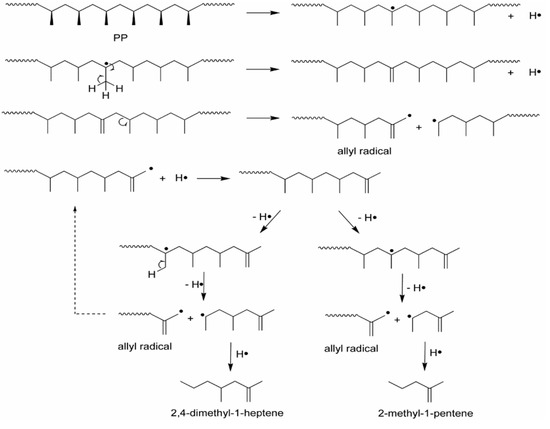 Proposed mechanisms for the formation of 2,4-dimethyl-1-heptene and 2-.methyl-1-pentene from isotactic polypropylene degradation.