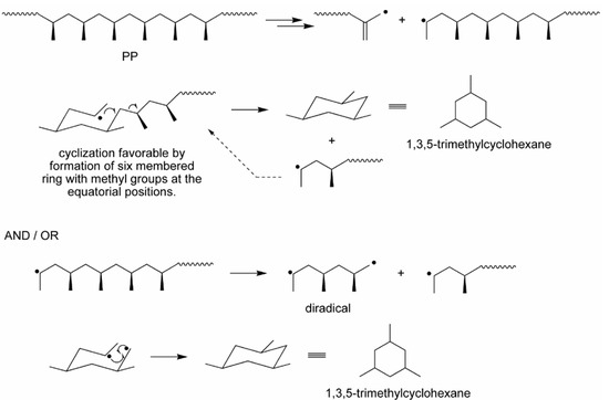 Proposed mechanism for the formation of 1,3,5-trimethyl-cyclohexane from the isotactic polypropylene degradation.