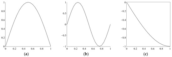 The finite element method is used to implement and perform the free-vibration analyses using a quadratic beam finite element (three nodes) with three degrees of freedom per node, namely . According to the finite element method, the generalized displacements will be described as linear combinations of the corresponding nodal degrees of freedom and the nodal shape functions. Strains will be obtained accordingly by considering Equation (6). Considering this and Equations (11), (18) and (19), one obtains the equilibrium equation at the element level [36].