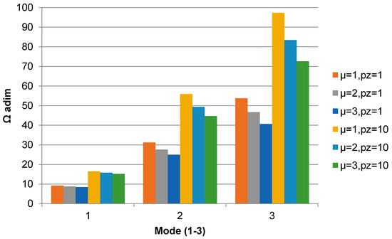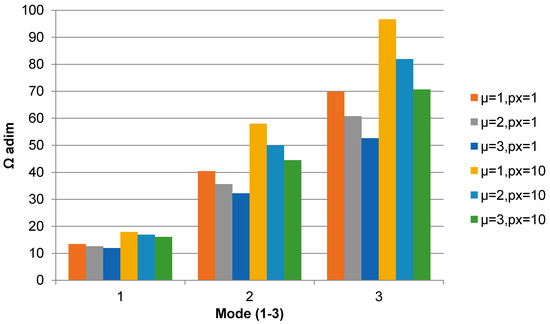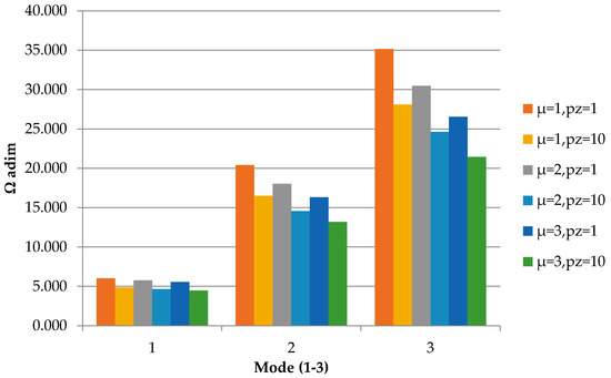 Table 6 and also Figure 9 allow the conclusion that the beams with a non-null gradient mixture along their length (FGM2-X) show greater nondimensional frequencies when compared with the FGM2-Z beams. In such a situation, one obtains ratios for the nondimensional fundamental frequencies that range from 15% to 19% within the exponents’ set .