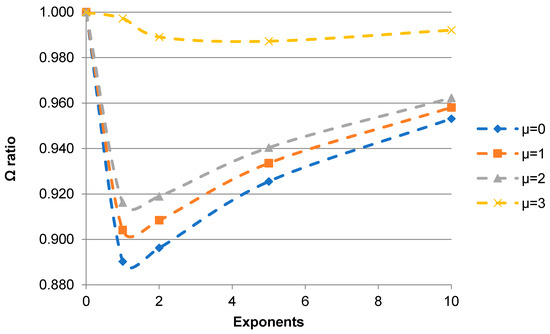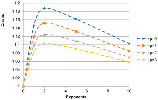 In the third mode case, the ratio maximum values occur for the maximum exponent considered, assuming successively the values 0.7%, 0.6%, 1.8% and 2.7%, as the nonlocal parameter goes from 0 to 3.