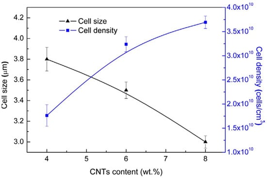 | PMMA | CNT | Supercritical CO2 foaming | Cell size 3.0–3.8 μm, cell density 1.8 × 1010–3.7 × 101 Cells/cm3 | [53] |