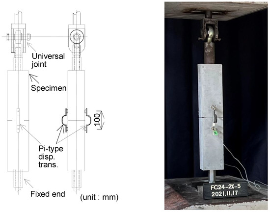 A uniaxial tension test is carried out using a universal testing machine with a capacity of 2MN. Figure 3 shows the setup of the loading and measurement for the uniaxial tension test. Since the increasing external moment caused by setup irregularity and local fracture caused by the secondary moment would be an inevitable factor in the experiment, pin-fix ends were applied at the boundaries to minimize possible effects on the results [30]. Two displacement transducers (Pi-type) were set at the middle area of 100 mm in length on both sides to measure the axial deformation at the slit position. The loading speed was set to be from 0.5 to 1 mm per minute as the head speed. Visible cracks observation and photographing were done after loading. In addition, the upper and lower parts of the specimen were forcibly pulled apart and fibers on the fracture surface were counted.