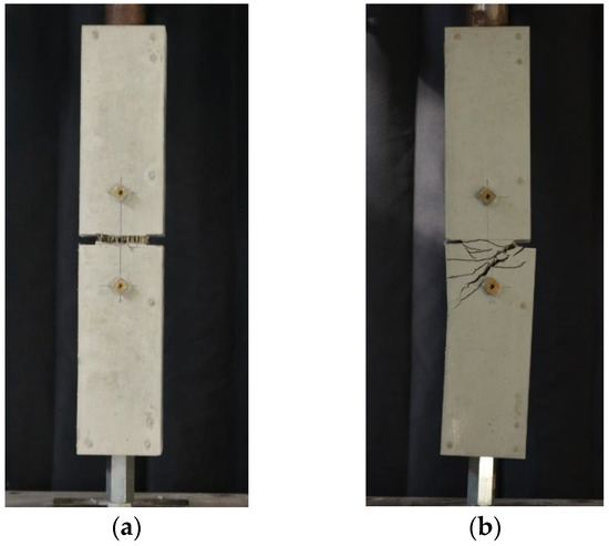 Figure 4 shows the typical failure modes of specimens. Failure modes of specimens can be mainly divided into two types: tensile failure and bending failure. The specimens of tensile failure generated obvious crack(s) throughout the slits on both sides. The specimens of bending failure generated slant cracks from one slit, and it did not penetrate the slit at the other side. The occurrence of bending failure is considered to be caused by the nonuniform distribution of the fibers in the matrix. The specimens, in which failure mode was detected to be bending failure, are not discussed in the following sections.