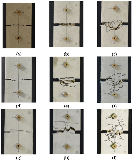 Examples of crack pattern (tensile failure): (a) Fc24-N; (b) Fc24-1%; (c) Fc24-2%; (d) Fc36-N; (e) Fc36-1%; (f) Fc36-2%; (g) Fc48-N; (h) Fc48-1%; (i) Fc48-2%.