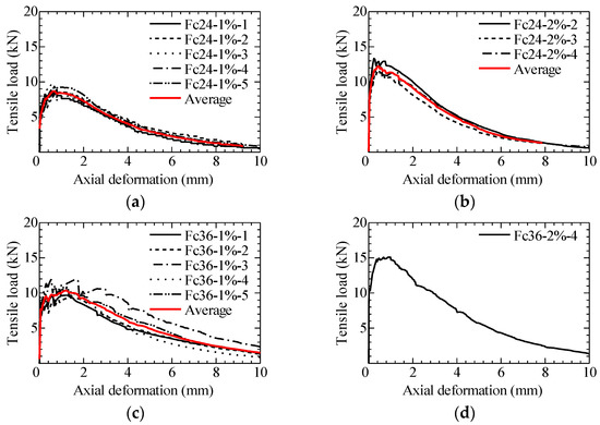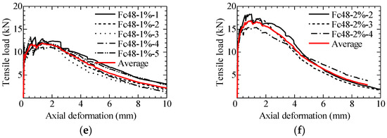 Tensile load-axial deformation relationship in uniaxial tension test: (a) Fc24-1%; (b) Fc24-2%; (c) Fc36-1%; (d) Fc36-2%; (e) Fc48-1%; (f) Fc48-2%.