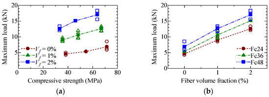 Relationship between maximum load and experimental parameters: (a) compressive strength; (b) fiber volume fraction.