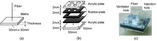 Figure 9 shows the dimensions of the specimen for the pullout test of the individual bundled aramid fiber and the constitution of the mold. The specimen is a thin plate made of the matrix without a fiber in which an individual fiber is embedded at the center of the plate. The dimension in the plane section is 30 × 30 mm2, and the thickness of the plate is one of the experimental parameters. The mold consists of two acrylic plates and three rubber plates. A total of five plates are fixed by bolts so as not to cause any visible deformation of the rubber plates. An individual fiber is positioned by the holes of the upper and lower rubber plates. A cementitious matrix is poured from the injection hole and the ventilator holes function so as not to make air voids. The thickness of the specimen is varied by changing the thickness of the middle rubber plate. The dimensions of the specimen and the mold are exactly the same as those used in the authors’ previous study [17].