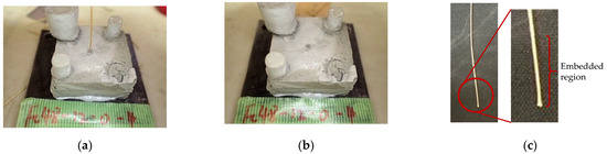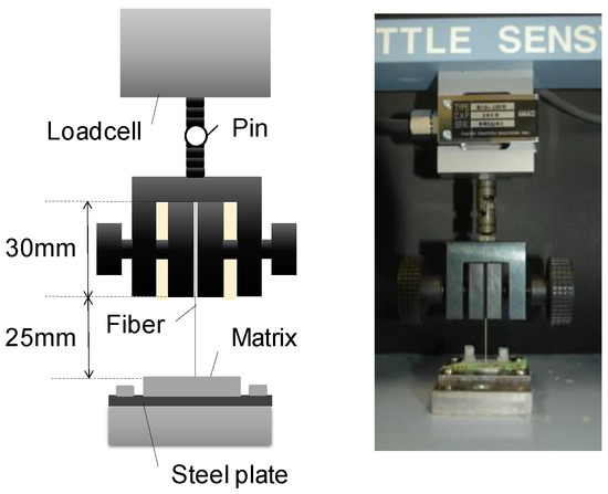 Pullout load was applied using an electronic system universal testing machine with a capacity of 200 N, as shown in Figure 10. The specimen was fixed via an adhered steel plate, and the embedded fiber was clamped directly by throwing a jig. The head speed was set to 1 mm per minute. The pullout load and head displacement were recorded. The loading and measurement methods are exactly the same as those applied in the authors’ previous study [17].