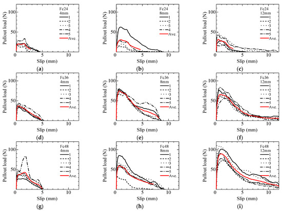 Pullout load-slip relationship in pullout test: (a) Fc24-4 mm; (b) Fc24-8 mm; (c) Fc24-12 mm; (d) Fc36-4 mm; (e) Fc36-8 mm; (f) Fc36-12 mm; (g) Fc48-4 mm; (h) Fc48-8 mm; (i) Fc48-12 mm.