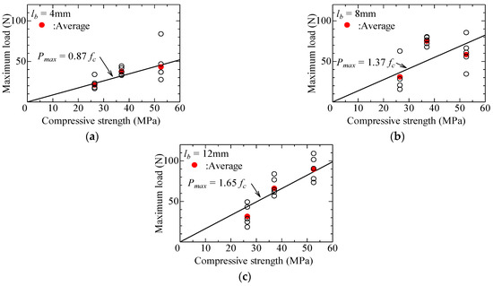 Relationship between maximum pullout load and compressive strength: (a) specimens with 4 mm embedded length; (b) specimens with 8 mm embedded length; (c) specimens with 12 mm embedded length.