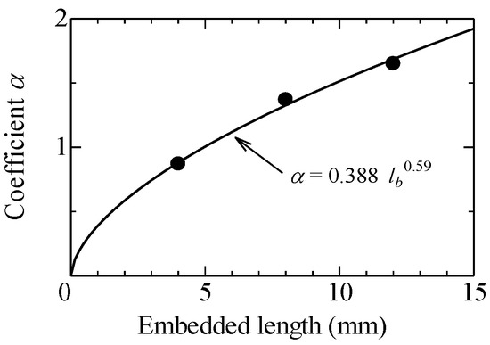 Figure 14 shows the relationship between the embedded length of the fiber (lb) and the coefficients of the lines (α) shown in Figure 13. The curve shown in the figure is obtained by the regression analysis as it is expressed by the powered function of the embedded length. Finally, the maximum pullout load can be evaluated by the following Equation (1).