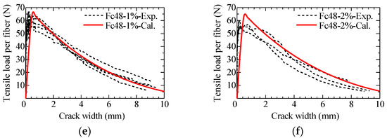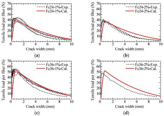 Tensile load is divided by the number of fibers, i.e., the counted number of fibers on the fracture surface in the case of the test results as described in Section 3.3, or the number of effective fibers [19] given by following Equation (2) in the case of the calculation. The crack width for the test results is obtained from the measured axial deformation divided by the number of cracks observed in the uniaxial tension test.