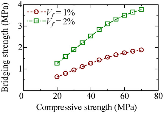 The effect of matrix strength on the maximum tensile load is investigated based on the bridging law calculation. Figure 16 shows the relationship between compressive strength and bridging strength, which is defined as the maximum tensile load divided by the cross-sectional area of the matrix. The calculations are carried out for several compressive strengths from 20 MPa to 70 MPa with fiber volume fractions (Vf) of 1% and 2%. The calculation results show that the bridging strength shows a linear relationship up to a compressive strength of around 50 MPa. Beyond 50 MPa, the increment of bridging strength becomes small. This is due to the rupture of fiber in the calculation.