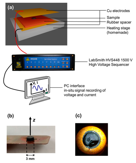 The electric field was applied to the polymer melt using a PC-controlled high-voltage sequencer (LabSmith, HVS448-1500, Livermore, CA, USA) in conjunction with a heating stage (Figure 1a). LabSmith Sequence PC software was used to generate a sinusoidal voltage while simultaneously recording voltage and current. The rate of data sampling and recording was 16 Hz. The composite sample was inserted into a circular hole of 3 mm diameter at the center of a 1 mm insulating silicone rubber spacer, which was then sandwiched between two copper electrodes. An image of the sample is given in Figure 1b. Copper wires were soldered onto the electrodes, which were in turn connected to the sequencer. The entire sandwich was placed on top of a homemade stainless-steel heating stage, constructed using a flexible heating element (40 W, 10 W/in2, Omega Engineering, Norwalk, CT, USA) and a PID temperature controller (Omega Engineering). An electric field was applied after the composite sample had been heated to 160 °C to reduce the viscosity of the polymer matrix. The electric field was applied until the maximal allowable current (~3–10 mA) had been reached, when part of the sample was burnt through. Smoke emitted from the sample, and the remaining sample always contained a hole (Figure 1c).