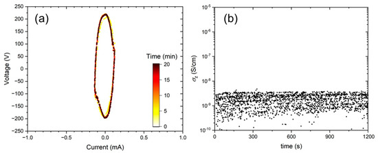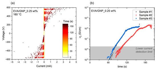 (a) Current–voltage characteristic behavior of EVA neat polymer at 160 °C under an alternating electric field of = 150 Vrms/mm and = 1 s−1. Cyclic hysteresis curve suggested that the EVA melt was an insulator and did not undergo dielectric breakdown. (b) Through-direction electrical conductivity at sequencer noise level.