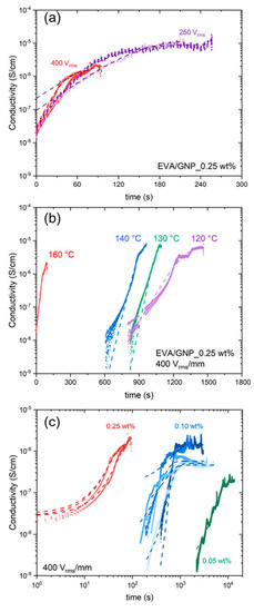 We lastly measured the evolution of electrical conductivity as a function of time when EVA/GNP composites were subject to an applied electric field up to the point of dielectric breakdown. We systematically varied electric field strength (Figure 4a), matrix viscosity (Figure 4b), or GNP concentration (Figure 4c) in order to understand factors that could influence the rate of dielectric breakdown within these composites.