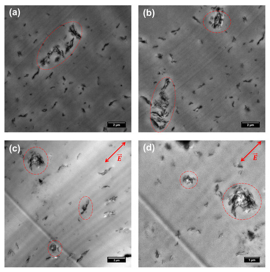 TEM images of EVA/GNP_0.25 wt % samples (a,b) before and (c,d) after 100 s electric field application ( = 400 Vrms/mm and = 1 s−1). (c,d) Direction of the alternating electric field determined by microtome artifacts. Locations of locally aggregated GNPs are highlighted by dashed circles.